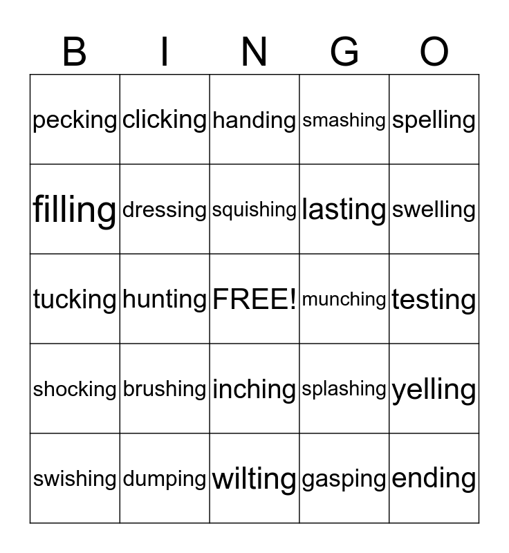 This bingo card has a free space and 24 words: brushing, dumping, squishing, swishing, spelling, pecking, filling, clicking, munching, inching, lasting, tucking, splashing, yelling, dressing, gasping, testing, handing, swelling, hunting, ending, shocking, smashing and wilting.