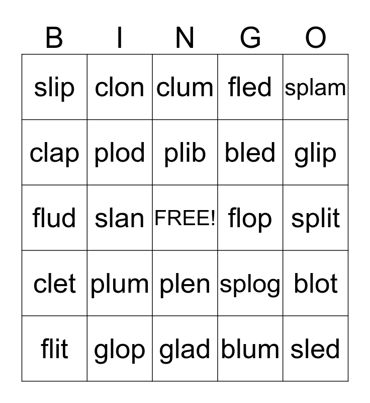 This bingo card has a free space and 28 words: blot, blab, bled, blum, clap, clum, clon, clet, flop, flit, flud, fled, glop, glad, glip, glub, plum, plod, plib, plen, slip, slot, sled, slan, split, splog, splam and splash.