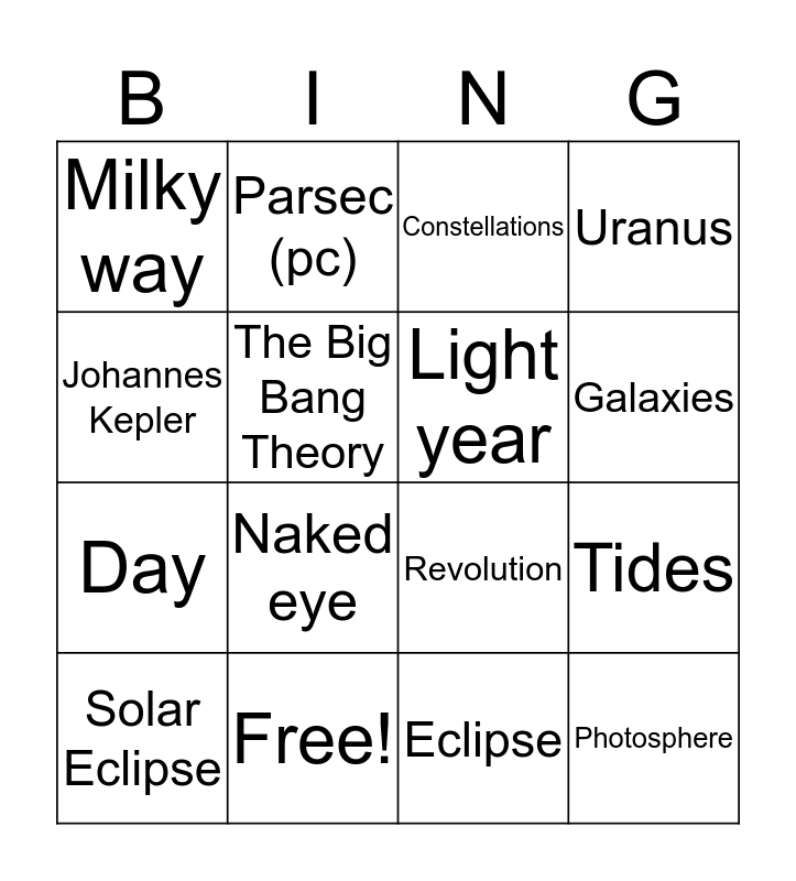 This bingo card has 22 words: Free!, Heliocentric model, Parsec (pc), Nebulae, The Big Bang Theory, Light year, Milky way, Constellations, Revolution, Photosphere, Day, Uranus, Eliptical plane, Sprout, Eclipse, Lunar month, Tides, Solar Eclipse, Naked eye, Johannes Kepler, Galaxies and Mercury.