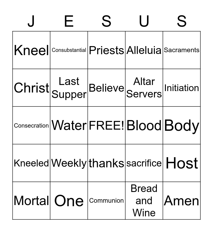 This bingo card has a free space and 29 words: Mortal, Chalice, Water, Apostles, Kneel, Priests, Last Supper, Weekly, Blood, One, Body, Amen, Communion, Bread and Wine, Initiation, Tongue, thanks, Kneeled, Sacraments, Consecration, sacrifice, Mass, Altar Servers, Christ, Alleluia, Consubstantial, Host, Believe and pray.