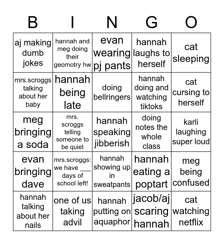 This bingo card has a free space and 32 words: jacob/aj scaring hannah, someone randomly hitting the woah, mrs. scroggs telling someone to be quiet, jocob forget to keep time, evan bringing dave, hannah being late, cat sleeping, meg being confused, hannah and meg doing their geomotry hw, evan and cat talking about swim, doing bellringers, evan wearing pj pants, jacob making jokes, mrs. scroggs: go get your chromebooks, doing notes the whole class, hannah making a ginger joke, hannah talking about her nails, meg bringing a soda, hannah showing up in sweatpants, mrs.scroggs: we have ___ days of school left!, hannah eating a poptart, hannah and meg talking about gymnastics, karli laughing super loud, one of us taking advil, cat watching netflix, hannah laughs to herself, hannah doing and watching tiktoks, mrs.scroggs talking about her baby, aj making dumb jokes, hannah putting on aquaphor, robert playing coolmath and cat cursing to herself.