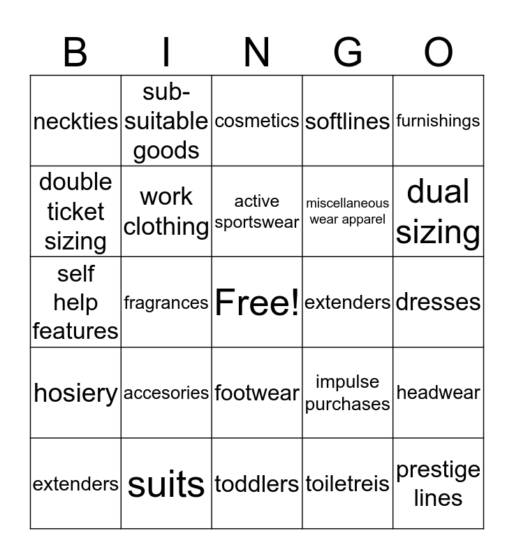 This bingo card has a free space and 24 words: accesories, suits, active sportswear, extenders, furnishings, neckties, double ticket sizing, sub-suitable goods, extenders, footwear, miscellaneous wear apparel, self help features, impulse purchases, headwear, work clothing, toiletreis, dresses, cosmetics, dual sizing, fragrances, prestige lines, hosiery, softlines and toddlers.