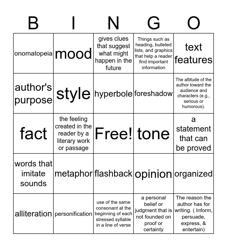 This bingo card has a free space and 24 words: metaphor, personification, hyperbole, alliteration, text features, onomatopeia, author's purpose, mood, tone, flashback, foreshadow, fact, opinion, organized, style, a personal belief or judgment that is not founded on proof or certainty, a statement that can be proved, gives clues that suggest what might happen in the future, The attitude of the author toward the audience and characters (e.g., serious or humorous)., the feeling created in the reader by a literary work or passage, The reason the author has for writing. ( Inform, persuade, express, & entertain), words that imitate sounds, Things such as heading, bulleted lists, and graphics that help a reader find important information and use of the same consonant at the beginning of each stressed syllable in a line of verse.