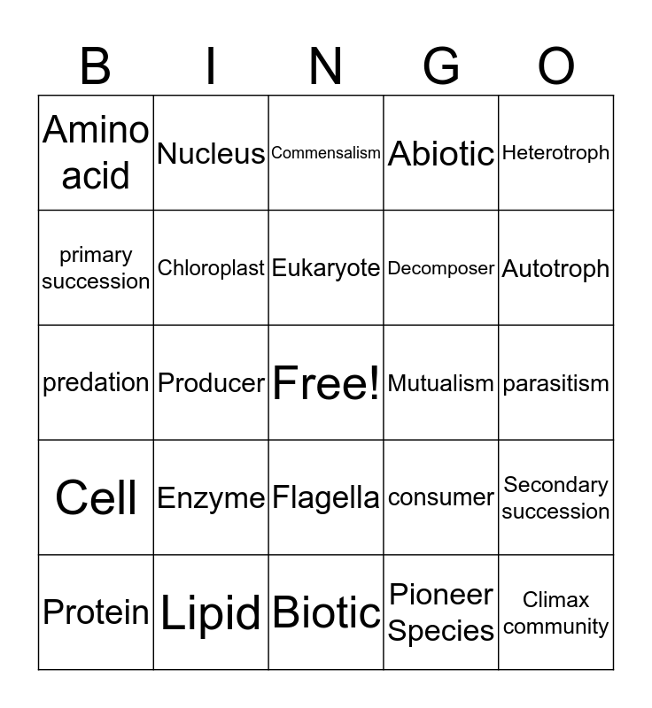 This bingo card has a free space and 24 words: Enzyme, Lipid, Eukaryote, Protein, Heterotroph, Amino acid, primary succession, Nucleus, Mutualism, Flagella, Decomposer, predation, consumer, Secondary succession, Chloroplast, Pioneer Species, parasitism, Commensalism, Autotroph, Producer, Climax community, Cell, Abiotic and Biotic.
