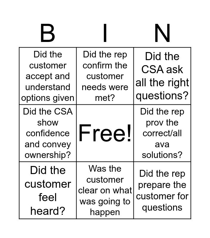 This bingo card has a free space and 8 words: Did the CSA show confidence and convey ownership?, Did the rep confirm the customer needs were met?, Did the rep prov the correct/all ava solutions?, Did the customer feel heard?, Did the CSA ask all the right questions?, Did the customer accept and understand options given, Was the customer clear on what was going to happen and Did the rep prepare the customer for questions.
