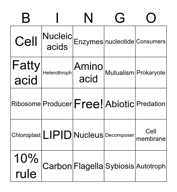 This bingo card has a free space and 24 words: LIPID, Carbon, Amino acid, 10% rule, Consumers, Cell, Fatty acid, Nucleic acids, Abiotic, Nucleus, Mutualism, Ribosome, Decomposer, Cell membrane, Heterothroph, Sybiosis, Predation, Enzymes, Prokaryote, Producer, Autotroph, Chloroplast, nucleotide and Flagella.