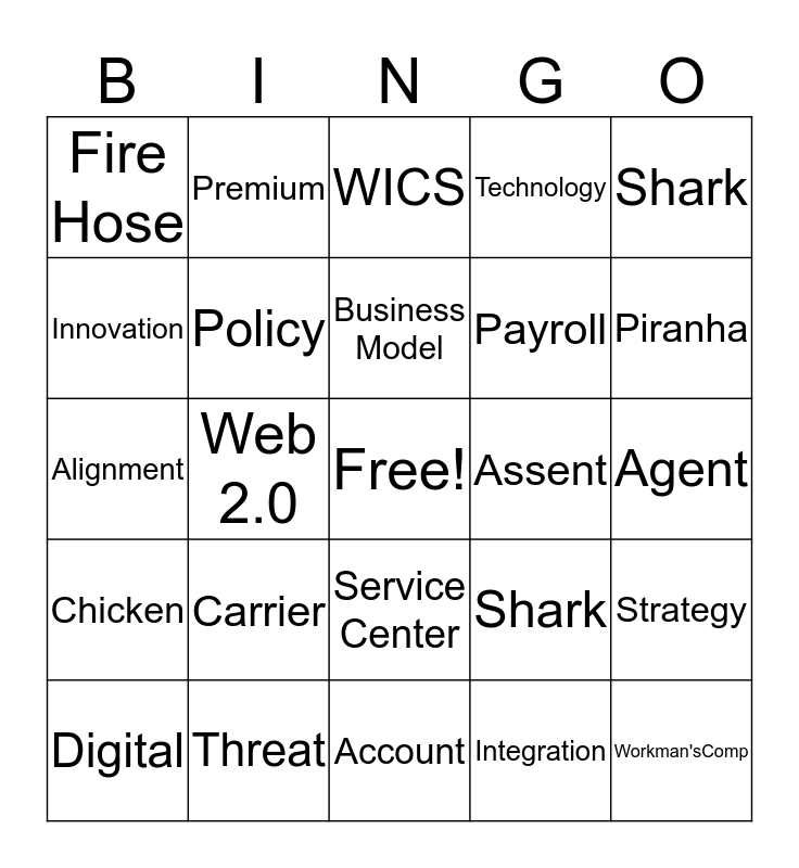 This bingo card has a free space and 24 words: Carrier, Threat, Business Model, Digital, Shark, Fire Hose, Innovation, Premium, Assent, Service Center, Payroll, Alignment, Shark, Strategy, Policy, Integration, Agent, WICS, Piranha, Web 2.0, Workman'sComp, Chicken, Technology and Account.