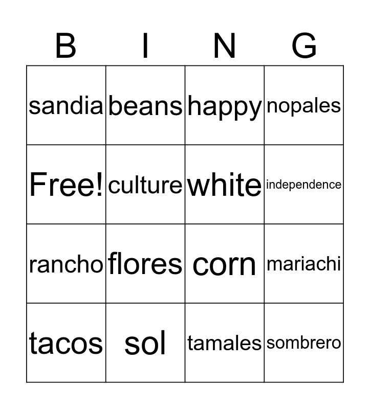 This bingo card has 37 words: Mexico, flag, red, white, green, snake, independence, pinata, Free!, party, mariachi, nopales, tacos, tamales, culture, sombrero, amigos, happy, zapatos, sol, sandia, flores, rainbow, musicos, guitar, rice, beans, burro, horse, rancho, animals, fields, corn, fiestas, friends, rancho and boots.