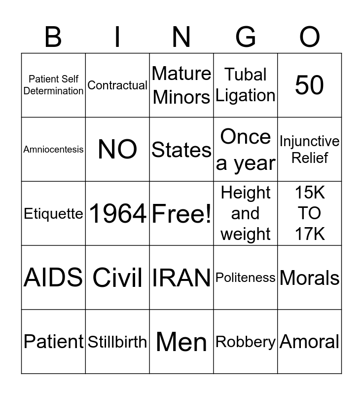This bingo card has a free space and 25 words: Patient, Civil, States, Robbery, Injunctive Relief, Patient Self Determination, Contractual, Mature Minors, Once a year, Morals, Etiquette, NO, Politeness, Amoral, Amniocentesis, Stillbirth, Men, Tubal Ligation, 15K TO 17K, AIDS, 1964, IRAN, Height and weight, 50 and Oregon 1977.