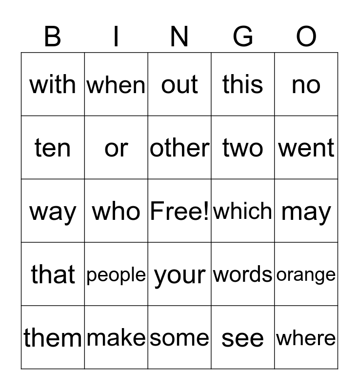 This bingo card has a free space and 24 words: people, make, other, them, no, with, ten, when, which, your, two, way, words, orange, or, see, may, out, went, who, where, that, this and some.