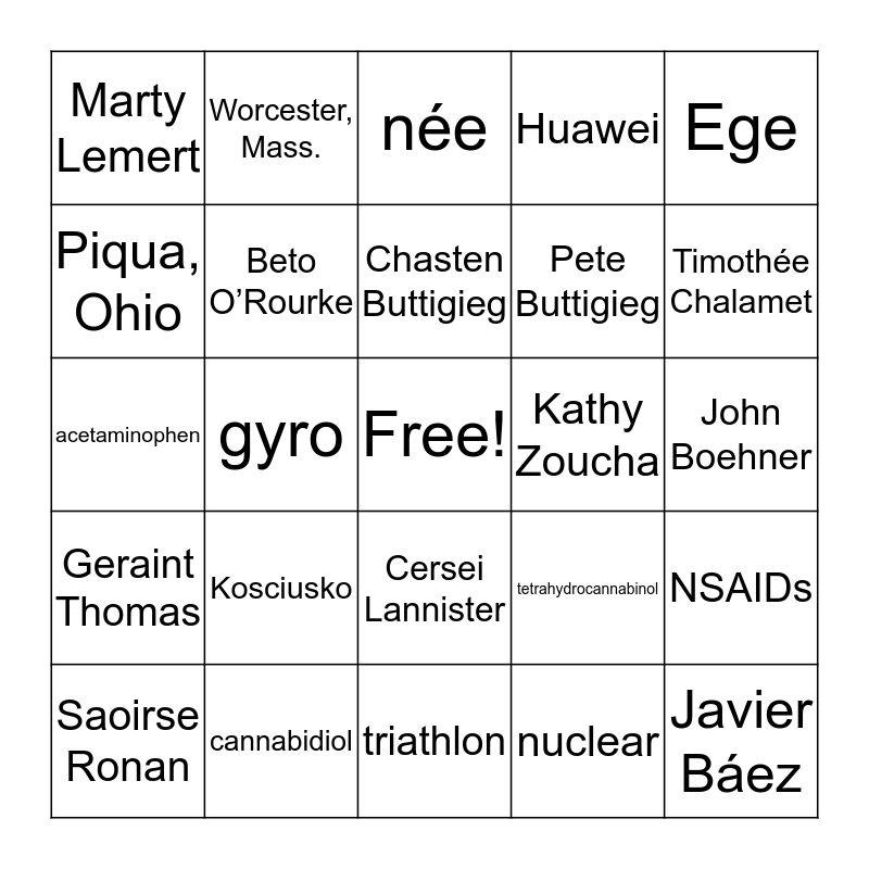 This bingo card has a free space and 40 words: açaí, acetaminophen, Amy Klobuchar, Beto O’Rourke, cannabidiol, Cersei Lannister, Chasten Buttigieg, Daenerys Targaryen, Ege, Geraint Thomas, gyro, Huawei, Javier Báez, John Boehner, Kathy Zoucha, Kosciusko, LaOtto, Marty Lemert, meme, née, NSAIDs, nuclear, Pete Buttigieg, Piqua, Ohio, Porsche, quinoa, Ralph Fiennes, Ralph Lauren, Reading, England, Recep Tayyip Erdoğan, Russ Jehl, Saoirse Ronan, Scipio, tetrahydrocannabinol, Timothée Chalamet, triathlon, Ultima Thule, Victor Oladipo, Worcester, Mass. and Zwick and Jahn.