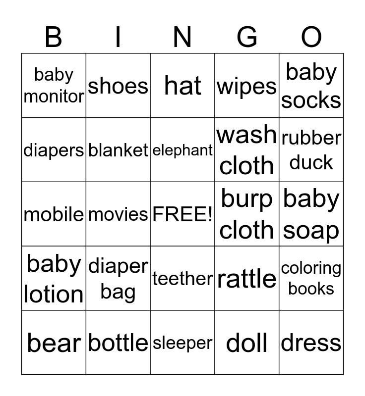 This bingo card has a free space and 24 words: diaper bag, bottle, elephant, bear, baby socks, baby monitor, diapers, shoes, burp cloth, teether, wash cloth, mobile, rattle, coloring books, blanket, doll, baby soap, hat, rubber duck, movies, dress, baby lotion, wipes and sleeper.