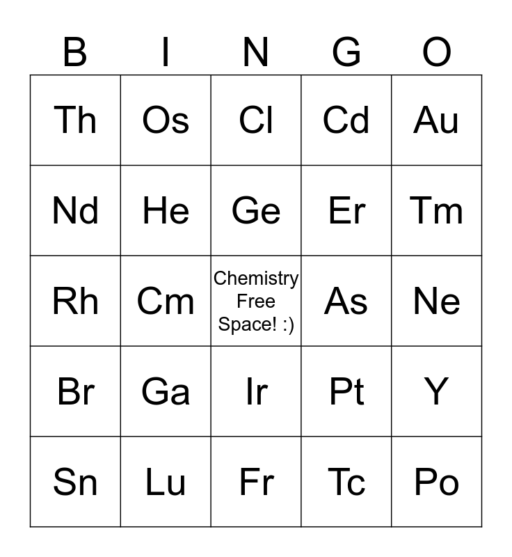 This bingo card has a free space and 118 words: H, N, Li, Be, B, C, He, O, F, Ne, Na, Mg, Al, Si, P, S, Ti, V, K, Ca, Lv, Cl, Ar, Cu, Zn, Fe, Co, Ni, Cr, Mn, Ga, Ge, As, Se, Br, Kr, Mo, Sr, Y, Zr, Sb, Rb, Tc, Ru, Rh, Pd, Ag, Cd, Xe, Sn, Nb, Te, I, In, Cs, Ba, La, Ce, Pr, Nd, Pm, Sm, Eu, Gd, Yb, Dy, Ho, Er, Tm, Tb, Lu, Hf, Ta, W, Hg, Os, Ir, Pt, Au, Re, Tl, Pb, Bi, Pu, Th, Rn, Fr, Ra, Ac, At, Pa, U, Np, Po, Am, Cm, Bk, Cf, Es, Fm, Md, No, Lr, Rf, Ds, Rg, Bh, Hs, Mt, Db, Sg, Ts, Nh, Fl, Mc, Sc, Cn and Og.
