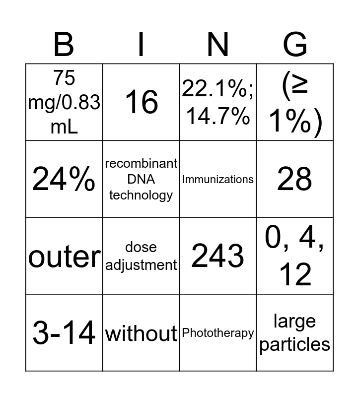 This bingo card has 20 words: 0, 4, 12, Caffeine; warfarin; omeprazole; metoprolol; midazolam, 22.1%; 14.7%, Yellow; opalescent, 3-14, 24%, without, 75 mg/0.83 mL, outer, 16, dose adjustment, 243, recombinant DNA technology, large particles, Immunizations, systemic therapy, 28, (≥ 1%), Phototherapy and 15 to 30 minutes.