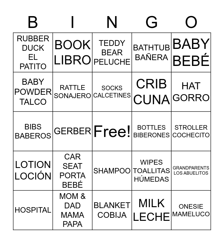 This bingo card has a free space and 29 words: HOSPITAL, FORMULA, GERBER, FAMILY FAMILIA, RUBBER DUCK EL PATITO, TEDDY BEAR PELUCHE, RATTLE SONAJERO, CAR SEAT PORTA BEBÉ, BOTTLES BIBERONES, MOM & DAD MAMA PAPA, STROLLER COCHECITO, ONESIE MAMELUCO, BLANKET COBIJA, MILK LECHE, HAT GORRO, PACIFIER CHUPON, SHAMPOO, LOTION LOCIÓN, BABY BEBÉ, BIBS BABEROS, WIPES TOALLITAS HÚMEDAS, DIAPER BAG PAÑALERA, CRIB CUNA, BABY POWDER TALCO, BATHTUB BAÑERA, BOOK LIBRO, GRANDPARENTS LOS ABUELITOS, SOCKS CALCETINES and DIAPERS PAÑALES.