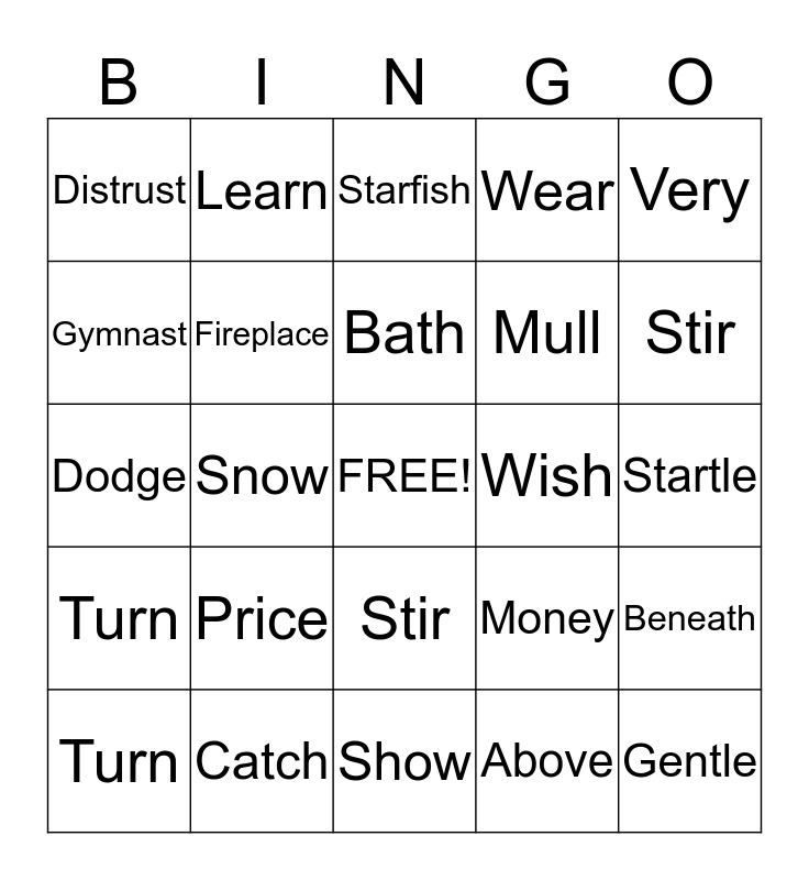 This bingo card has a free space and 24 words: Price, Catch, Bath, Turn, Very, Distrust, Gymnast, Learn, Wish, Stir, Mull, Dodge, Money, Beneath, Fireplace, Above, Startle, Starfish, Stir, Snow, Gentle, Turn, Wear and Show.