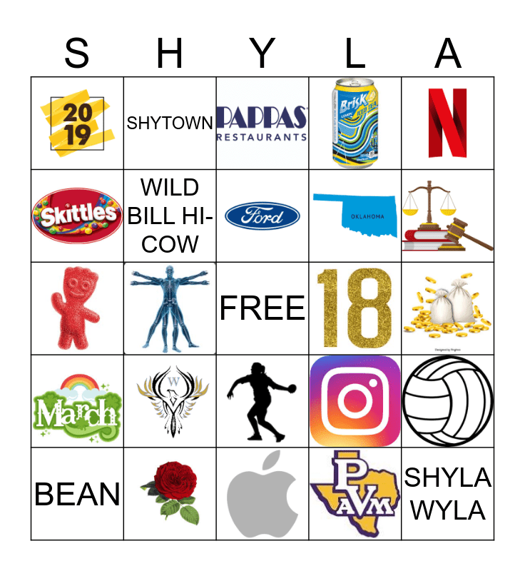 This bingo card has 20 images, a free space and 4 words: BEAN, SHYTOWN, WILD BILL HI-COW and SHYLA WYLA.