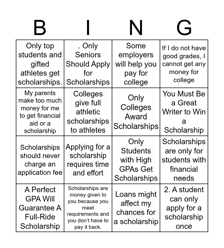 This bingo card has 16 words: Scholarships are money given to you because you meet requirements and you don’t have to pay it back., Scholarships are only for students with financial needs, Some employers will help you pay for college, Only top students and gifted athletes get scholarships., Scholarships should never charge an application fee, . Only Seniors Should Apply for Scholarships, Only Students with High GPAs Get Scholarships, Loans might affect my chances for a scholarship, My parents make too much money for me to get financial aid or a scholarship, Colleges give full athletic scholarships to athletes, A Perfect GPA Will Guarantee A Full-Ride Scholarship, If I do not have good grades, I cannot get any money for college, Applying for a scholarship requires time and effort, You Must Be a Great Writer to Win a Scholarship, Only Colleges Award Scholarships and 2. A student can only apply for a scholarship once.