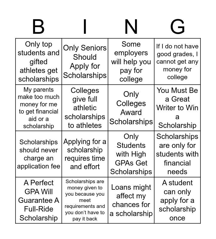 This bingo card has 16 words: Scholarships are money given to you because you meet requirements and you don’t have to pay it back, Scholarships are only for students with financial needs, Some employers will help you pay for college, Only top students and gifted athletes get scholarships, Scholarships should never charge an application fee, Only Seniors Should Apply for Scholarships, Only Students with High GPAs Get Scholarships, Loans might affect my chances for a scholarship, My parents make too much money for me to get financial aid or a scholarship, Colleges give full athletic scholarships to athletes, A Perfect GPA Will Guarantee A Full-Ride Scholarship, If I do not have good grades, I cannot get any money for college, Applying for a scholarship requires time and effort, You Must Be a Great Writer to Win a Scholarship, Only Colleges Award Scholarships and A student can only apply for a scholarship once.