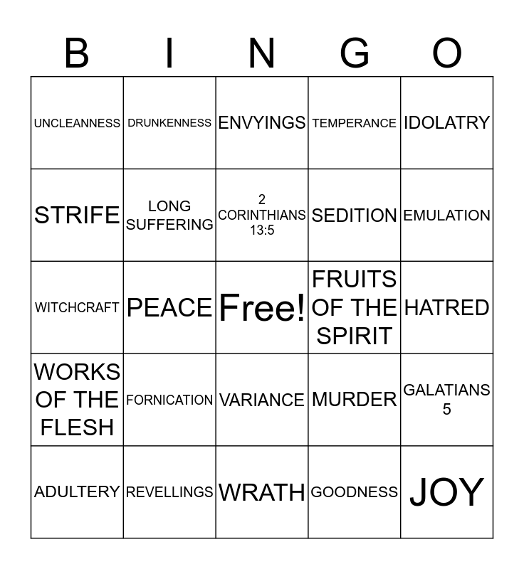 This bingo card has a free space and 29 words: ADULTERY, HERESIES, PEACE, MEEKNESS, UNCLEANNESS, ENVYINGS, LONG SUFFERING, FORNICATION, FRUITS OF THE SPIRIT, REVELLINGS, HATRED, JOY, WRATH, GOODNESS, EMULATION, GENTLENESS, VARIANCE, WORKS OF THE FLESH, IDOLATRY, WITCHCRAFT, MURDER, LOVE, SEDITION, STRIFE, TEMPERANCE, DRUNKENNESS, GALATIANS 5, 2 CORINTHIANS 13:5 and Acts 3:19.