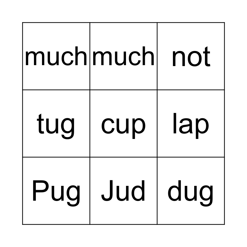 This bingo card has 14 words: gum, pup, Pug, much, tug, cup, dug, lip, Jud, much, nap, lap, not and pop.
