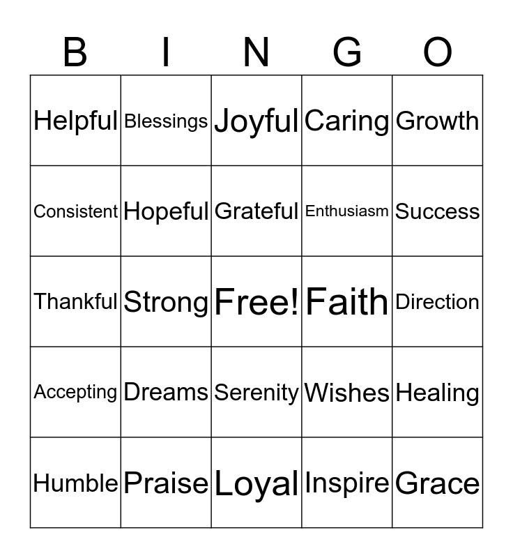This bingo card has a free space and 34 words: Believe, Inspire, Friendship, Motivating, Accepting, Hopeful, Growth, Humble, Blessings, Unify, Grateful, Joyful, Pride, Self Love, Faith, Success, Praise, Thankful, Dreams, Wishes, Serenity, Genuine, Helpful, Direction, Loyal, Grace, Caring, Forgiving, Enthusiasm, Consistent, Peace, Strong, Healing and Community.