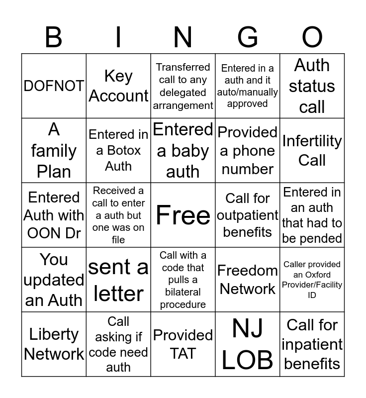 This bingo card has a free space and 41 words: DME Benefits, Entered Auth with OON Dr, Entered in a drug Auth, Entered in a Botox Auth, Call asking if code need auth, Call with a code that pulls a bilateral procedure, Entered a baby auth, A code that is Golden Ruled, Auth status call, You updated an Auth, Received a call to enter a auth but one was on file, Entered in a auth and it auto/manually approved, Call for inpatient benefits, Entered in an auth that had to be pended, Call for outpatient benefits, sent a letter, Phone call with a Choice Plus Provier, DOFNOT, Auth with an expedited review, Transferred call to any delegated arrangement, Caller provided an Oxford Provider/Facility ID, Provided an address, Provided TAT, Provided a phone number, NY LOB, CT LOB, NJ LOB, Medical Dental, Infertility Call, Chiropractic, Hearing Aid Benefits, Key Account, Liberty Network, Garden Network, Freedom Network, A family Plan, Metro Network, A Individual Plan, Precert Exception List, Member ID that migrated and Oxford as secondary.