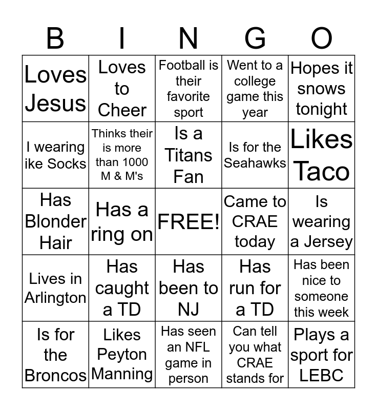 This bingo card has a free space and 24 words: Has caught a TD, Likes Peyton Manning, Is a Titans Fan, Is for the Broncos, Hopes it snows tonight, Loves Jesus, I wearing ike Socks, Loves to Cheer, Came to CRAE today, Has been to NJ, Is for the Seahawks, Has Blonder Hair, Has run for a TD, Has been nice to someone this week, Thinks their is more than 1000 M & M's, Can tell you what CRAE stands for, Is wearing a Jersey, Football is their favorite sport, Likes Taco, Has a ring on, Plays a sport for LEBC, Lives in Arlington, Went to a college game this year and Has seen an NFL game in person.