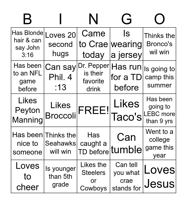 This bingo card has a free space and 24 words: Thinks the Seahawks will win, Is younger than 5th grade, Dr. Pepper is their favorite drink, Loves to cheer, Thinks the Bronco's wil win, Has Blonde hair & can say John 3:16, Has been to an NFL game before, Loves 20 second hugs, Likes Taco's, Has caught a TD before, Has run for a TD before, Likes Peyton Manning, Can tumble, Went to a college game this year, Can say Phil. 4 :13, Can tell you what crae stands for, Has been going to LEBC more than 9 yrs, Came to Crae today, Is going to camp this summer, Likes Broccoli, Loves Jesus, Has been nice to someone, Is wearing a jersey and Likes the Steelers or Cowboys.