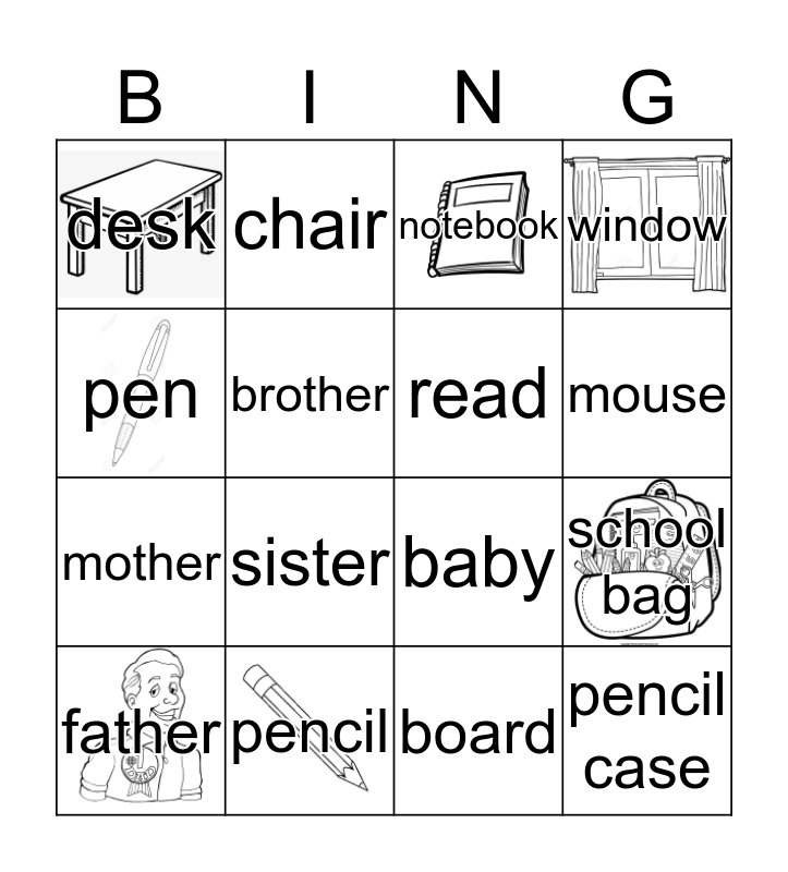 This bingo card has 10 images and 20 words: school bag, eraser, notebook, book, father, pen, pencil, desk, mother, chair, sister, baby, brother, pencil case, read, write, mouse, window, board and clock.