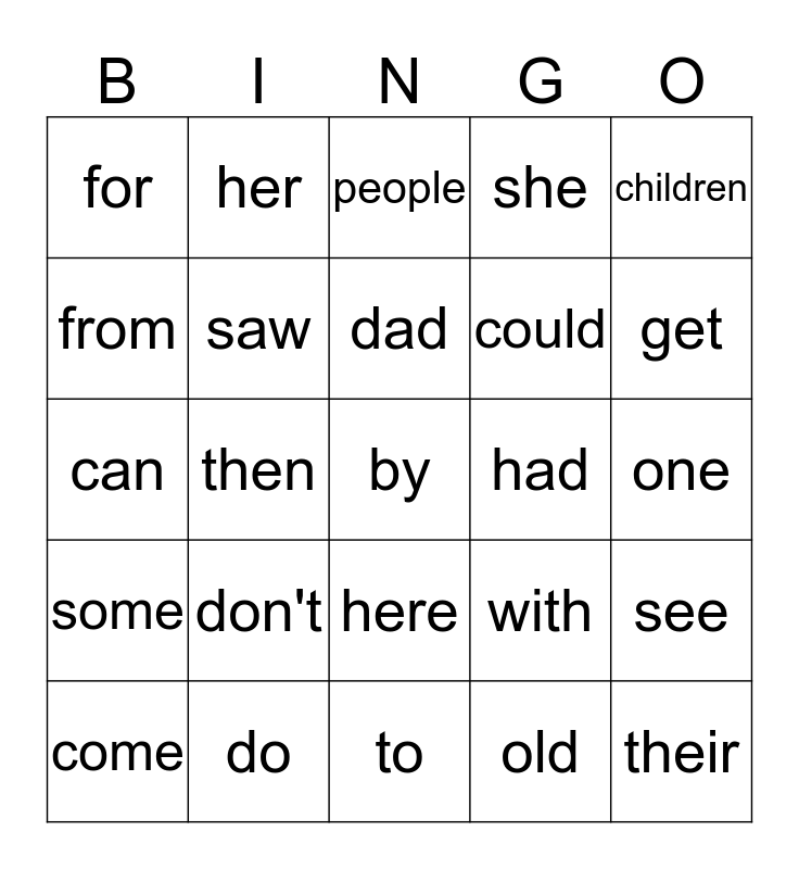This bingo card has a free space and 24 words: don't, do, dad, come, children, for, from, her, had, here, could, can, with, see, saw, old, one, people, get, then, their, some, she and to.