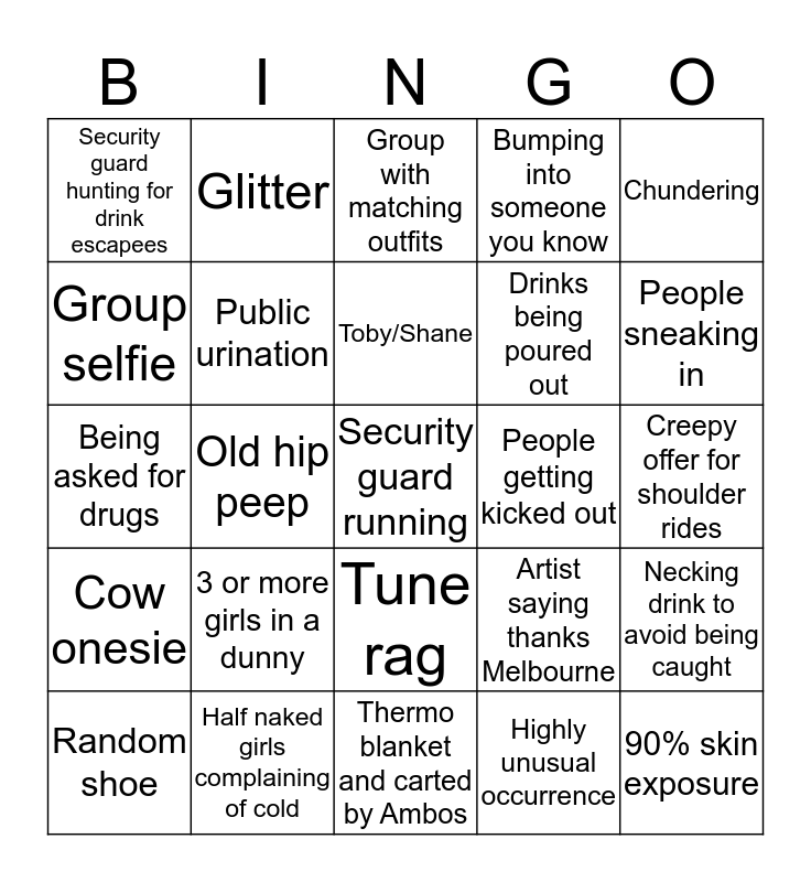 This bingo card has 33 words: 90% skin exposure, Nudity, Old hip peep, Whole family, Cow onesie, Public urination, Chundering, Random shoe, Glitter, Wings, Toby/Shane, Group with matching outfits, People hunting for cans, Unsafe shoulder ride, People getting kicked out, People sneaking in, Half naked girls complaining of cold, Being asked for drugs, 3 or more girls in a dunny, Artist saying thanks Melbourne, Tune rag, Depressed security guard, Security guard hunting for drink escapees, Creepy offer for shoulder rides, Thermo blanket and carted by Ambos, Security guard running, Bumping into someone you know, Drinks being poured out, Group selfie, Necking drink to avoid being caught, Group selfie being crashed by stranger, Highly unusual occurrence and Strangers meet wearing same outfits.