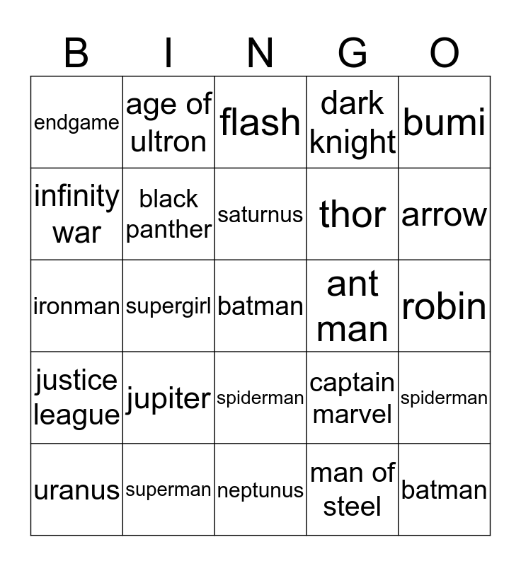 This bingo card has 25 words: jupiter, neptunus, saturnus, uranus, bumi, endgame, infinity war, age of ultron, ant man, spiderman, thor, ironman, captain marvel, spiderman, black panther, batman, robin, flash, arrow, supergirl, batman, superman, justice league, dark knight and man of steel.