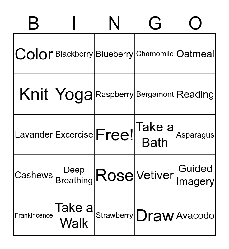 This bingo card has a free space and 24 words: Deep Breathing, Take a Walk, Raspberry, Frankincence, Oatmeal, Color, Knit, Blackberry, Take a Bath, Rose, Bergamont, Lavander, Vetiver, Guided Imagery, Yoga, Draw, Asparagus, Blueberry, Reading, Excercise, Avacodo, Cashews, Chamomile and Strawberry.
