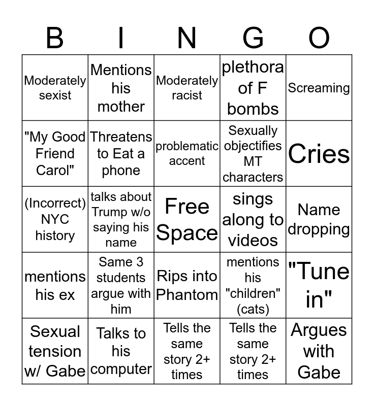 This bingo card has a free space and 24 words: Same 3 students argue with him, Talks to his computer, problematic accent, Sexual tension w/ Gabe, Screaming, Moderately sexist, "My Good Friend Carol", Mentions his mother, sings along to videos, Rips into Phantom, Sexually objectifies MT characters, (Incorrect) NYC history, mentions his "children" (cats), "Tune in", Threatens to Eat a phone, Tells the same story 2+ times, Name dropping, Moderately racist, Cries, talks about Trump w/o saying his name, Argues with Gabe, mentions his ex, plethora of F bombs and Tells the same story 2+ times.