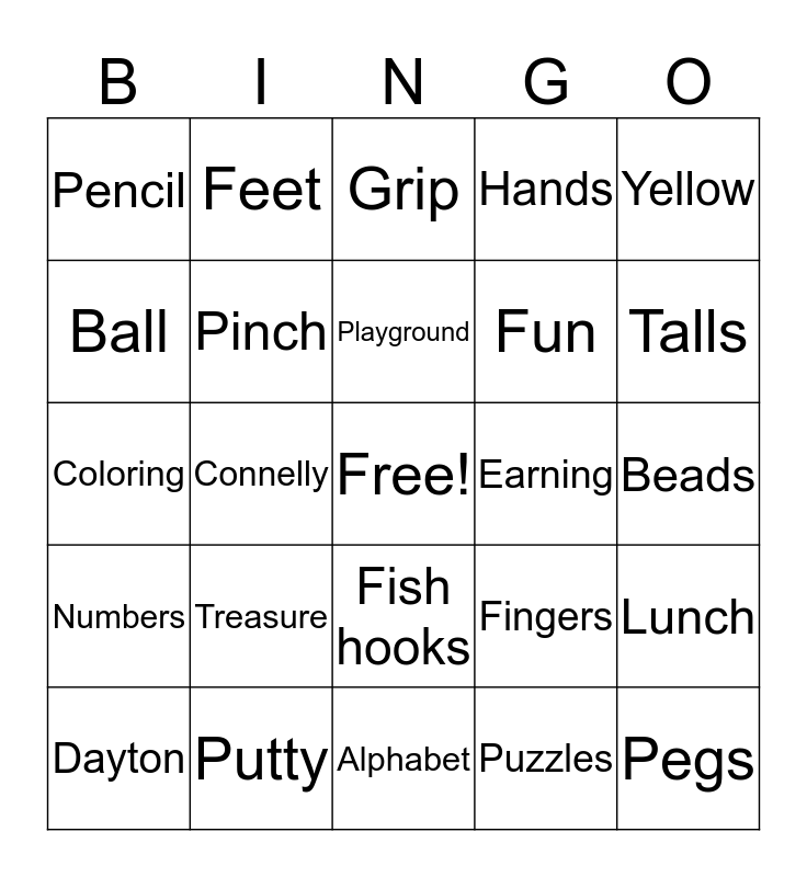 This bingo card has a free space and 29 words: Dayton, OT, Connelly, Pen, Pencil, Grip, Pinch, Treasure, Earning, Putty, Beads, Pegs, Alphabet, Puzzles, Talls, Smalls, Fish hooks, Numbers, Yellow, Coloring, Fingers, School, Fun, Ball, Hands, Feet, Lunch, Playground and Summer.
