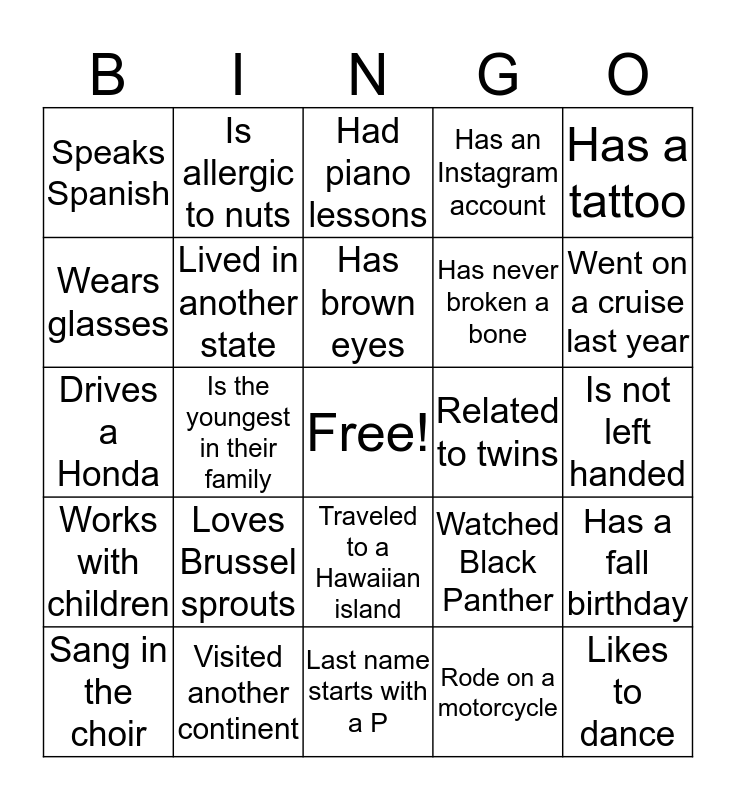 This bingo card has a free space and 24 words: Loves Brussel sprouts, Visited another continent, Has brown eyes, Sang in the choir, Has a tattoo, Speaks Spanish, Wears glasses, Is allergic to nuts, Related to twins, Traveled to a Hawaiian island, Has never broken a bone, Drives a Honda, Watched Black Panther, Has a fall birthday, Lived in another state, Rode on a motorcycle, Is not left handed, Had piano lessons, Went on a cruise last year, Is the youngest in their family, Likes to dance, Works with children, Has an Instagram account and Last name starts with a P.