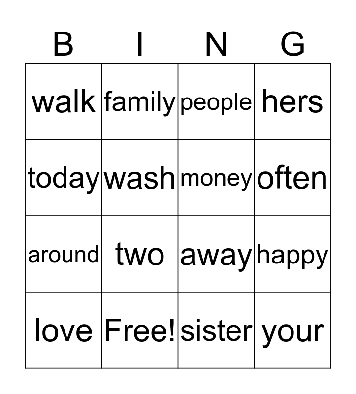 This bingo card has 25 words: only, once, often, thought, today, walk, wash, family, Free!, full, around, away, mother, more, money, love, sister, people, two, happy, love, kind, your, hers and smile.