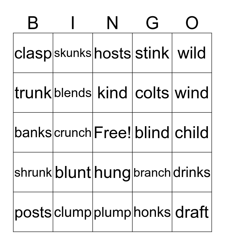 This bingo card has a free space and 24 words: blunt, clump, kind, posts, wild, clasp, trunk, skunks, blind, hung, colts, banks, branch, drinks, blends, honks, child, hosts, wind, crunch, draft, shrunk, stink and plump.