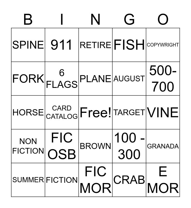 This bingo card has a free space and 24 words: FIC OSB, FICTION, PLANE, SUMMER, COPYWRIGHT, SPINE, FORK, 911, TARGET, BROWN, AUGUST, HORSE, 100 - 300, GRANADA, 6 FLAGS, CRAB, VINE, RETIRE, 500-700, CARD CATALOG, E MOR, NON FICTION, FISH and FIC MOR.