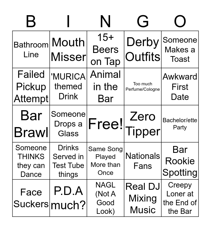 This bingo card has a free space and 42 words: OMGIT's My Birthday, Animal in the Bar, GREEK ATTACK (sorrority/fraternity), Drinks Served in Test Tube things, Real DJ Mixing Music, Bar Rookie Spotting, Creepy Loner at the End of the Bar, Cell Phone Zombies, 15+ Beers on Tap, Same Song Played More than Once, Bachelor/ette Party, Awkward First Date, Someone Drops a Glass, Someone Makes a Toast, Ridiculously Photogenic Bartender, Nationals Fans, Fruity Umbrella Drink, Bar Brawl, Group Shots, Mouth Misser, Failed Pickup Attempt, Swapping Digits, Tourist Group, Bathroom Line, Sunglasses Inside, The D.D., Too much Perfume/Cologne, Cinco de Mayo Deal, Selfie with a Selfie Stick, Live Music, Beer Flight, Someone THINKS they can Dance, 'MURICA themed Drink, NAGL (Not A Good Look), Tinder/Bumble Date meetup, Face Suckers, P.D.A much?, Zero Tipper, Train Wreck, Bro band, Derby Outfits and Derby Hats.