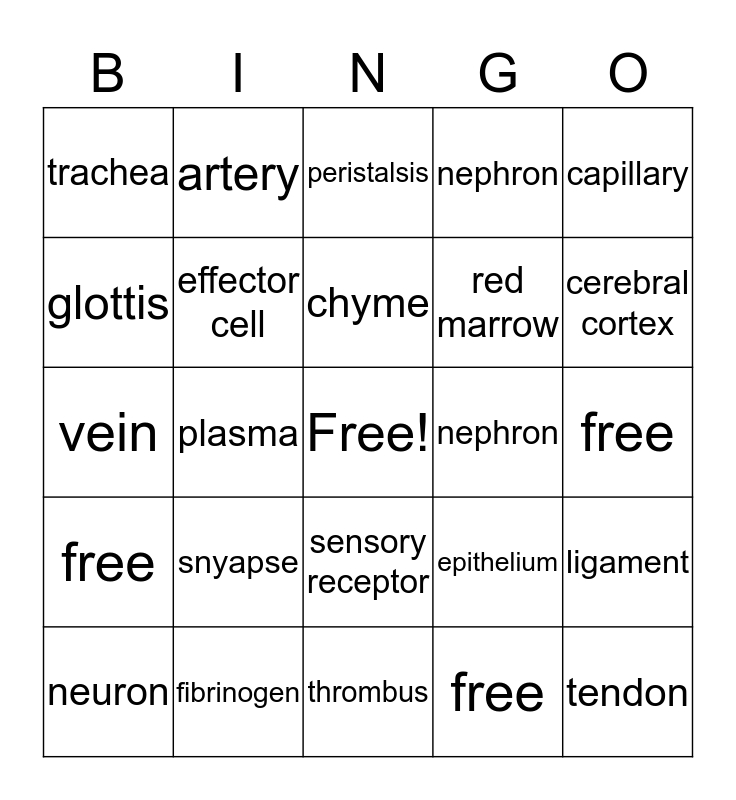 This bingo card has a free space and 24 words: neuron, snyapse, chyme, free, capillary, trachea, artery, peristalsis, nephron, free, vein, effector cell, epithelium, ligament, glottis, fibrinogen, thrombus, nephron, cerebral cortex, free, plasma, sensory receptor, red marrow and tendon.