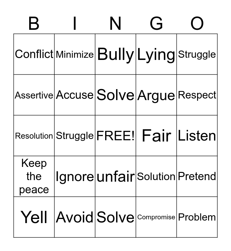 This bingo card has a free space and 29 words: Yell, Aggressive, Struggle, Blame, Conflict, Bully, Accuse, Ignore, Fair, Avoid, Listen, Problem, Solve, Compromise, Respect, Collaborate, unfair, Keep the peace, Struggle, Resolution, Solution, Talk, Argue, Assertive, Lying, Minimize, Pretend, Solve and Resolve.
