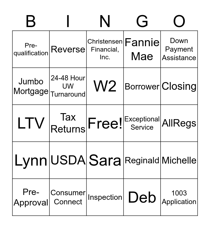 This bingo card has a free space and 82 words: FHA, Down Payment, Christensen Financial, Inc., We know home loans, Construction to Perm loan, New Build, Mortgage, Closing Costs, Appraisal, Clear to Close, APR, Great Interest Rates, 24-48 Hour UW Turnaround, Exceptional Service, Commitment letter, Pre-qualification, Pre-Approval, Jumbo Mortgage, Loan Officer, Rate Lock, Sales Contract, Borrower, 1003 Application, Down Payment Assistance, Tax Returns, Pay Stubs, Disclosures, Appraisal Fee, Title, VA, USDA, Conventional, LTV, Homeowners Insurance, Mortgage Insurance, Inspection, Loan Estimate, Underwriting, Closing, Good faith estimate, Freddie Mac, Fannie Mae, DPA, Bond, Refinance, Reverse, Survey, W2, Rate, Real Estate Agent, CFI, AllRegs, Consumer Connect, Total Expert, Encompass, Hannah, Ashley, Leslie, Troy, Reginald, Yasha, Jenni, Lynn, Laura, Megan, Colette, Brandon, Jonathan, Taylor, Shaheen, Pamela, Laurie, Sara, Deb, Nick, Sam, Jessica, Sasha, Jill, Tara, Michelle and Kristen.
