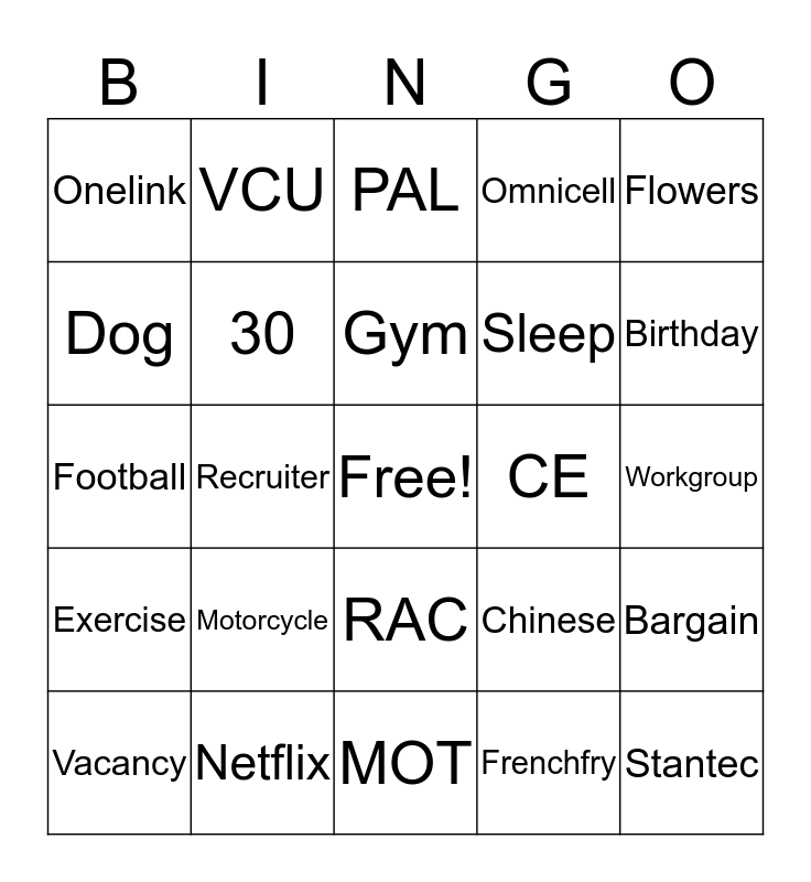 This bingo card has a free space and 37 words: Children, Married, 50, 30, Bargain, Motorcycle, Gym, Aldi, Flowers, Walmart, Recruiter, Omnicell, Stantec, Workgroup, Dog, Exercise, Honda, PAL, RAC, CE, Onelink, Birthday, Vacancy, MOT, McKesson, Frenchfry, VCU, COUPA, Mom, Productivity, Ticket, Netflix, Football, UVA, Chinese, Sleep and Wine.