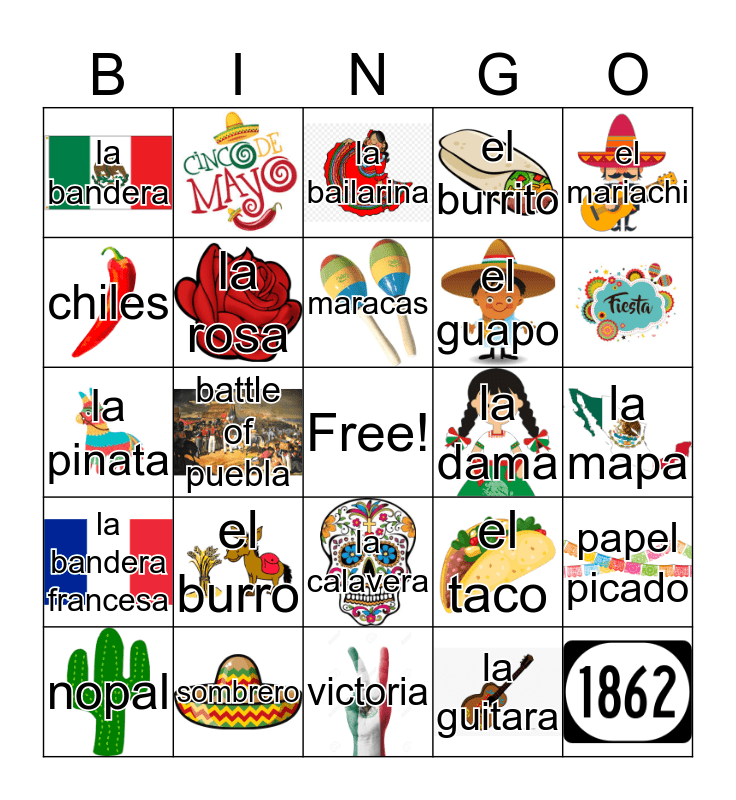 This bingo card has 24 images, a free space and 21 words: el burro, sombrero, maracas, nopal, el mariachi, la bandera, chiles, la dama, la calavera, el guapo, la pinata, el taco, papel picado, la rosa, la guitara, la mapa, la bailarina, battle of puebla, la bandera francesa, el burrito and victoria.