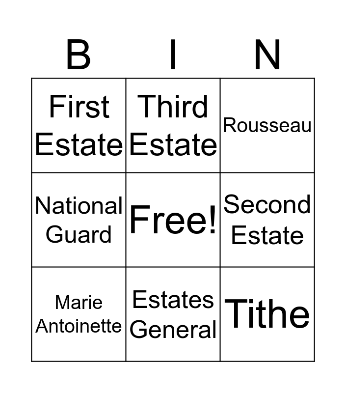 This bingo card has a free space and 24 words: Fall of Bastille, Tennis Court Oath, Estates General, Taille, Tithe, First Estate, Second Estate, Third Estate, Clergy, Nobility, Privileges, Absolute Monarchy, Louis XVI, Five Right Of Kings, Marie Antoinette, Age of Enlightenment, Age of Reason, Rousseau, Voltaire, Montesquieu, Share Power, Ripe of Revolution, National Guard and Bread Storyages.