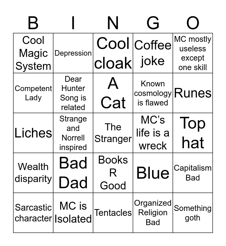 This bingo card has a free space and 24 words: Bad Dad, MC is Isolated, A Cat, Sarcastic character, MC mostly useless except one skill, Cool Magic System, Competent Lady, Depression, MC’s life is a wreck, Books R Good, Known cosmology is flawed, Liches, Blue, Capitalism Bad, Dear Hunter Song is related, Organized Religion Bad, Top hat, Cool cloak, Runes, Strange and Norrell inspired, Something goth, Wealth disparity, Coffee joke and Tentacles.