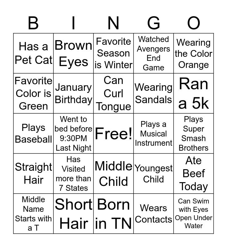 This bingo card has a free space and 24 words: Has Visited more than 7 States, Short Hair, Can Curl Tongue, Middle Name Starts with a T, Wearing the Color Orange, Has a Pet Cat, Favorite Color is Green, Brown Eyes, Plays a Musical Instrument, Middle Child, Wearing Sandals, Plays Baseball, Youngest Child, Ate Beef Today, January Birthday, Wears Contacts, Plays Super Smash Brothers, Favorite Season is Winter, Ran a 5k, Went to bed before 9:30PM Last Night, Can Swim with Eyes Open Under Water, Straight Hair, Watched Avengers End Game and Born in TN.