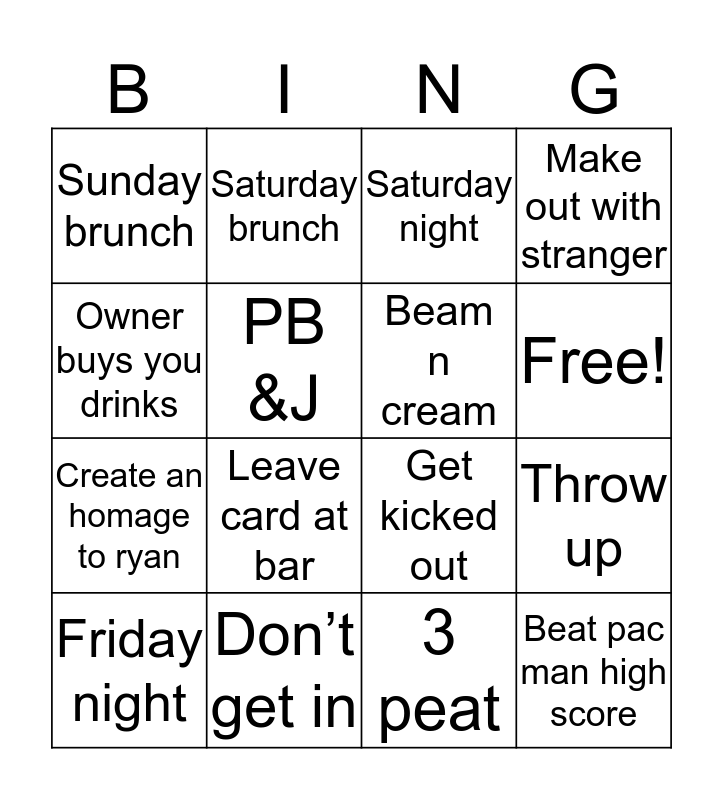 This bingo card has 17 words: 3 peat, Friday night, Saturday night, Sunday brunch, Leave card at bar, Make out with stranger, Throw up, Beam n cream, Free!, PB &J, Don’t get in, Get kicked out, Owner buys you drinks, Saturday brunch, Create an homage to ryan, Get drinks comped and Beat pac man high score.